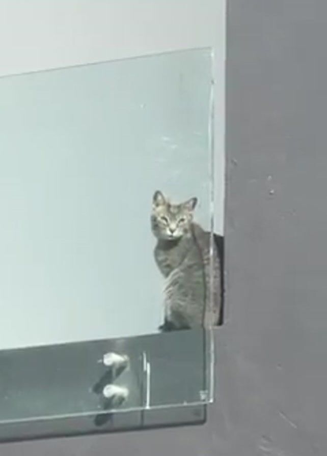 A gray cat sits on a dark ledge beside a glass panel attached to a gray wall