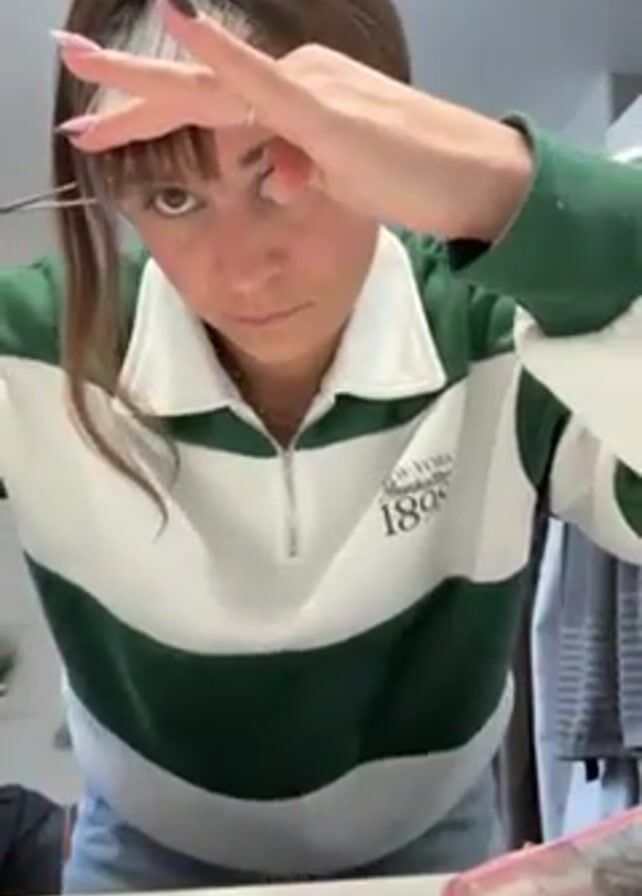A woman with brown hair pulled back in a ponytail, wearing a white and green striped quarter-zip sweatshirt, is cutting her bangs