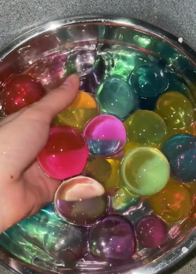 A hand reaches into a metal bowl filled with water and colorful water beads