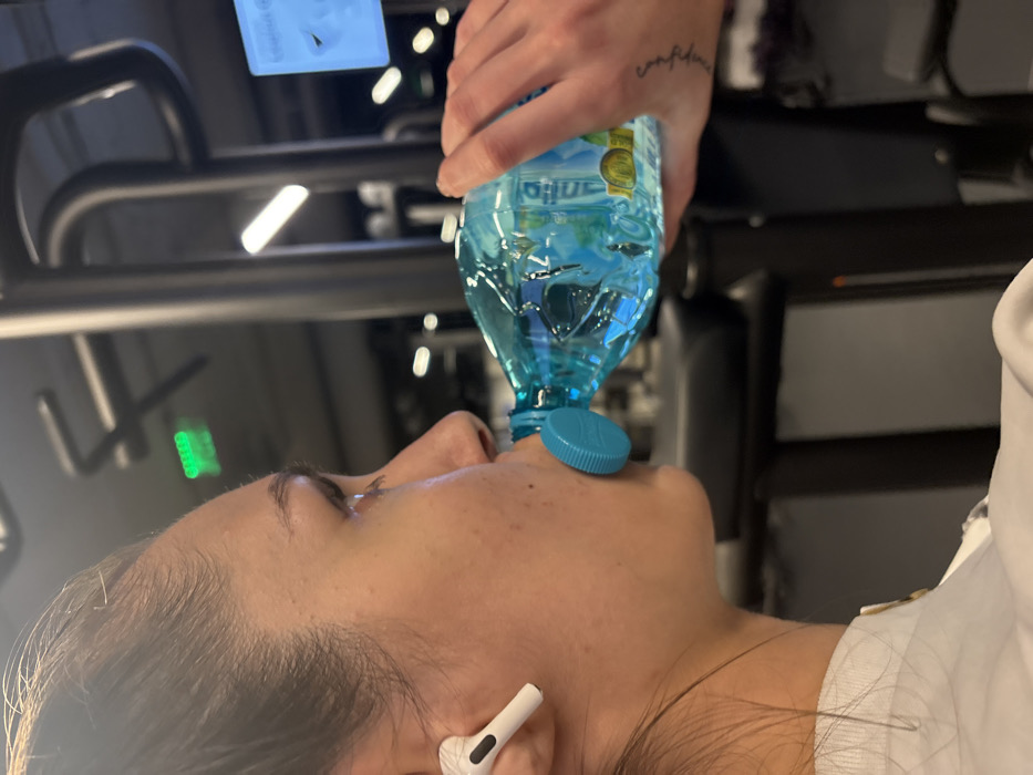 A person is depicted in a left-profile, medium close-up view from the upper torso, actively drinking from a transparent blue plastic bottle