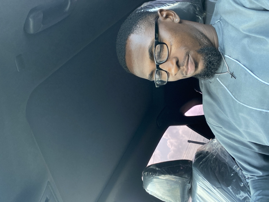 An adult male is seated within the interior of a vehicle, located in Igboefon, Nigeria. The male has a dark complexion, short dark hair with a fade, a beard, and a mustache. He wears black-rimmed eyeglasses, a gray garment, and a silver chain necklace with a black cross pendant. A small stud earring is present in his left earlobe. His eyes appear closed or cast downwards, and his facial expression is relaxed. The vehicle's interior features a dark-colored headliner and black seats. An adjacent seat's headrest, to the left of the male, is covered in clear plastic protective wrapping. Through a vehicle window, a bright sky with white clouds and a chain-link fence are visible in the background.