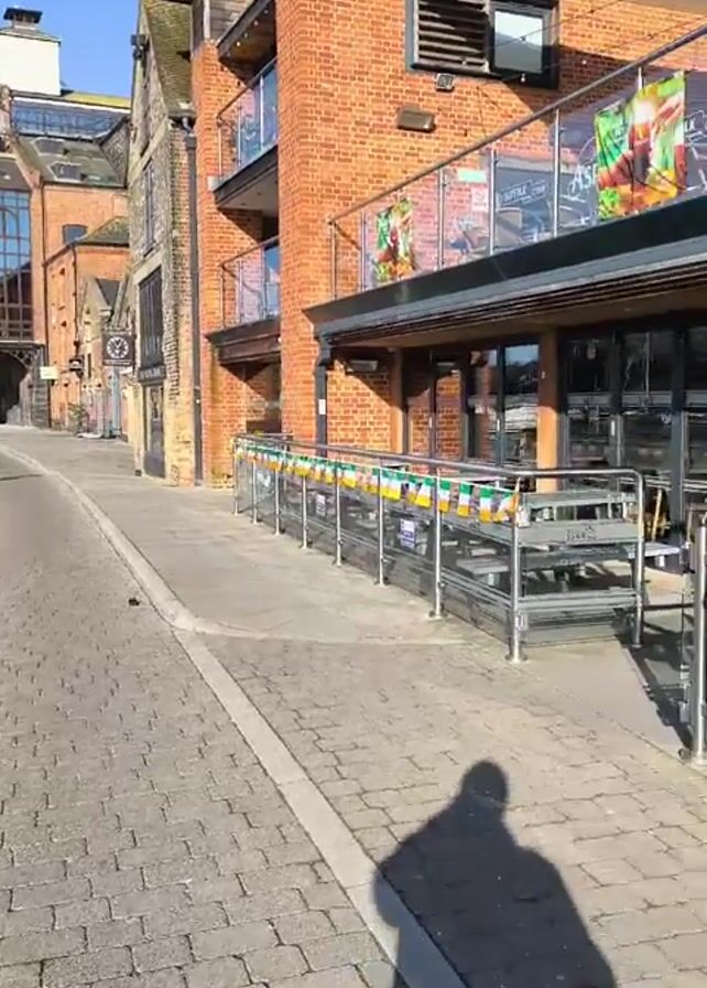 street scene with a pub called Isaacs on the right side. The street is paved with brick and the buildings are made of brick and wood. There are tables and chairs outside the pub, and there are Irish flags decorating the railing. There is a green umbrella outside one of the entrances to the pub. The sky is blue and the sun is shining. The shadow of the person holding the camera is visible on the ground.