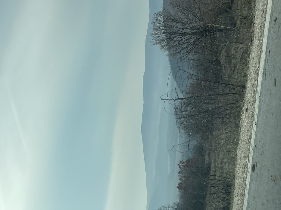 A landscape photograph captured in the vicinity of Kamchiya, Bulgaria, displays a natural environment under an overcast sky. The foreground, occupying the lower portion of the image, features a section of asphalt road with a partial white demarcation line visible along its edge. Immediately beyond the road is a sparse dirt and gravel shoulder transitioning into a gentle slope. This midground area is covered with dormant vegetation, including numerous bare deciduous trees and shrubs, some exhibiting gnarled or thorny branches. Patches of dry, light-colored ground and minimal undergrowth are visible between the trees. In the background, successive ranges of hills and low mountains recede into the distance, characterized by a pronounced atmospheric haze that softens their contours and imparts a blue-grey hue. The sky, occupying the upper two-thirds of the frame, is largely overcast with diffuse light, appearing as a uniform light blue-grey expanse with no distinct cloud features. No human subjects, animals, or artificial structures other than the depicted road are present.