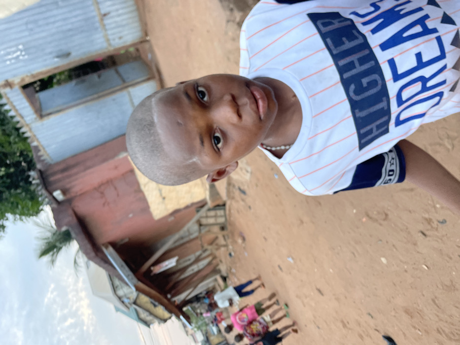 A young person wearing a white t-shirt with blue and black writing stands outside on a sandy surface. A group of people are gathered in the distance. Behind the subject are partially constructed or dilapidated structures made of wood and corrugated metal. The sky is visible in the background, suggesting an outdoor setting, possibly in a less developed area.