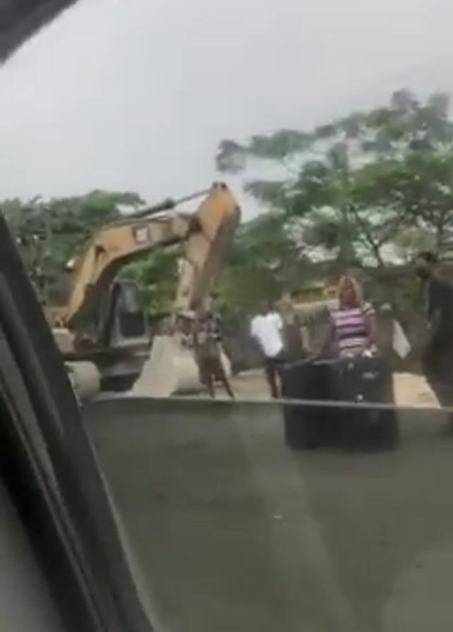 From inside a vehicle, the video shows an outdoor scene with multiple people standing near two large yellow CAT excavators, which are parked on a road or paved area. The sky is overcast. There are trees in the background, and what appears to be a utility pole. Several people are seen standing and possibly observing the excavators. One person is wearing a reflective vest. The vehicle seems to be moving slowly past the scene.