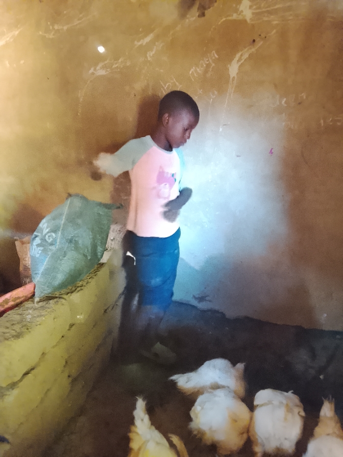 A young child stands indoors in a space containing chickens. The child, dressed in a pink and green shirt and dark shorts, faces downward. Several chickens with white feathers are gathered on the ground near the child. A bag is positioned atop a low wall, likely part of a structure used to contain the chickens. The walls appear to be made of a mud-like material, with writing visible on one. The lighting is dim, with a bright spot appearing on the wall.