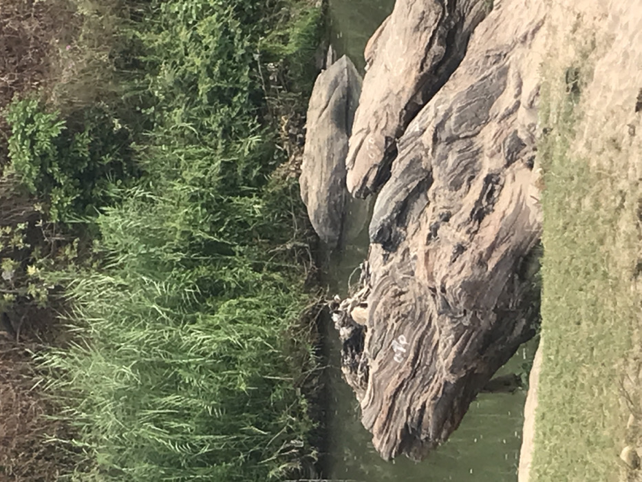 An uneven, large rock formation dominates the scene, displaying striated patterns. It sits beside a body of water, with grassy vegetation lining the edge. Additional rocks are partly submerged in the water. On the opposite bank, dense green bushes and taller grasses extend, filling the background. The light is bright, revealing details in the rock texture.