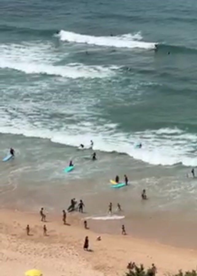 n elevated shot of a beach filled with people. The sandy beach has a scattering of people sunbathing, walking along the shore, and playing. The water is a mix of turquoise and white due to the waves. Several people are surfing, some standing on boards while others are in the process of catching a wave. A few colorful umbrellas are visible on the beach. The camera pans to offer a wider view of the beach and the sea. In the foreground, the tops of some green trees and bushes are visible.