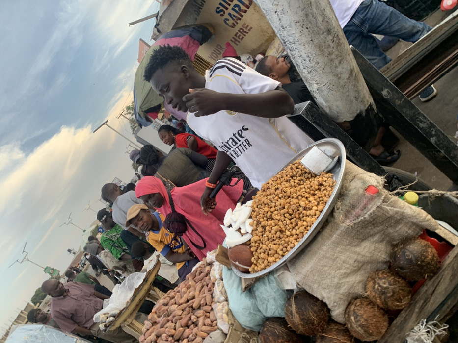 A street vendor, wearing a white jersey, stands next to a cart of goods at a bustling market. A platter of roasted nuts and sliced coconut sits atop a burlap sack surrounded by whole coconuts. A woman in a pink hijab and a child wearing a yellow and blue shirt are in the background. Other people mill about the market behind them, under a partially cloudy sky. A person lies nearby. The scene seems to be set up in a city in Africa.