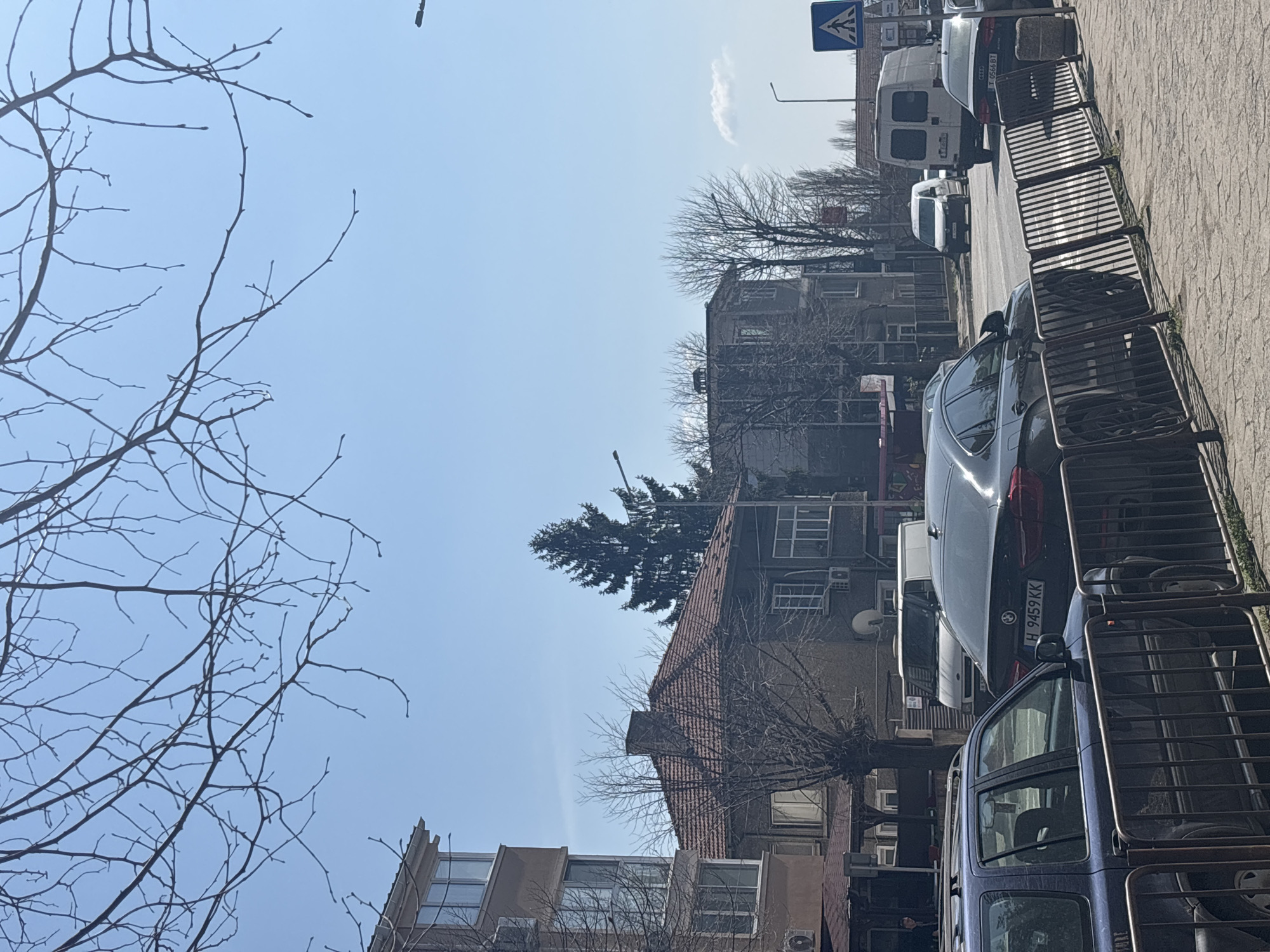 This image displays an urban street scene in Shumen, Bulgaria, under a clear blue sky, indicative of late winter or early spring due to the bare tree branches. The perspective is from a paved sidewalk, separated from the street by dark metal railings. In the foreground, a dark blue SUV with roof rails is parked on the left, partially obscured by the railings. To its right, a dark grey BMW X6 (Bulgarian license plate H 9459 KK) is also parked parallel to the curb. Further down the street, a white Ford Transit van (Bulgarian license plate partially visible, starting H 52...) is stopped, and another white van is visible in the distance. A dark sedan (Bulgarian license plate T 0566 BT) is parked on the right side of the street. A blue pedestrian crossing sign with a white icon is erected on the right. The left side of the scene features a multi-story residential building with balconies and visible air conditioning units. Central to the background is a two-story house with a brown tiled roof and a prominent chimney, accompanied by several bare deciduous trees. Behind and to the right of this house, a tall, dark green coniferous tree stands. Other buildings with similar architectural styles are visible further down the street on the right. A single, small white cloud is present in the upper right quadrant of the sky. One individual is partially visible behind the dark blue SUV on the left, standing near a building entrance. No other people or specific interactions are discernable.