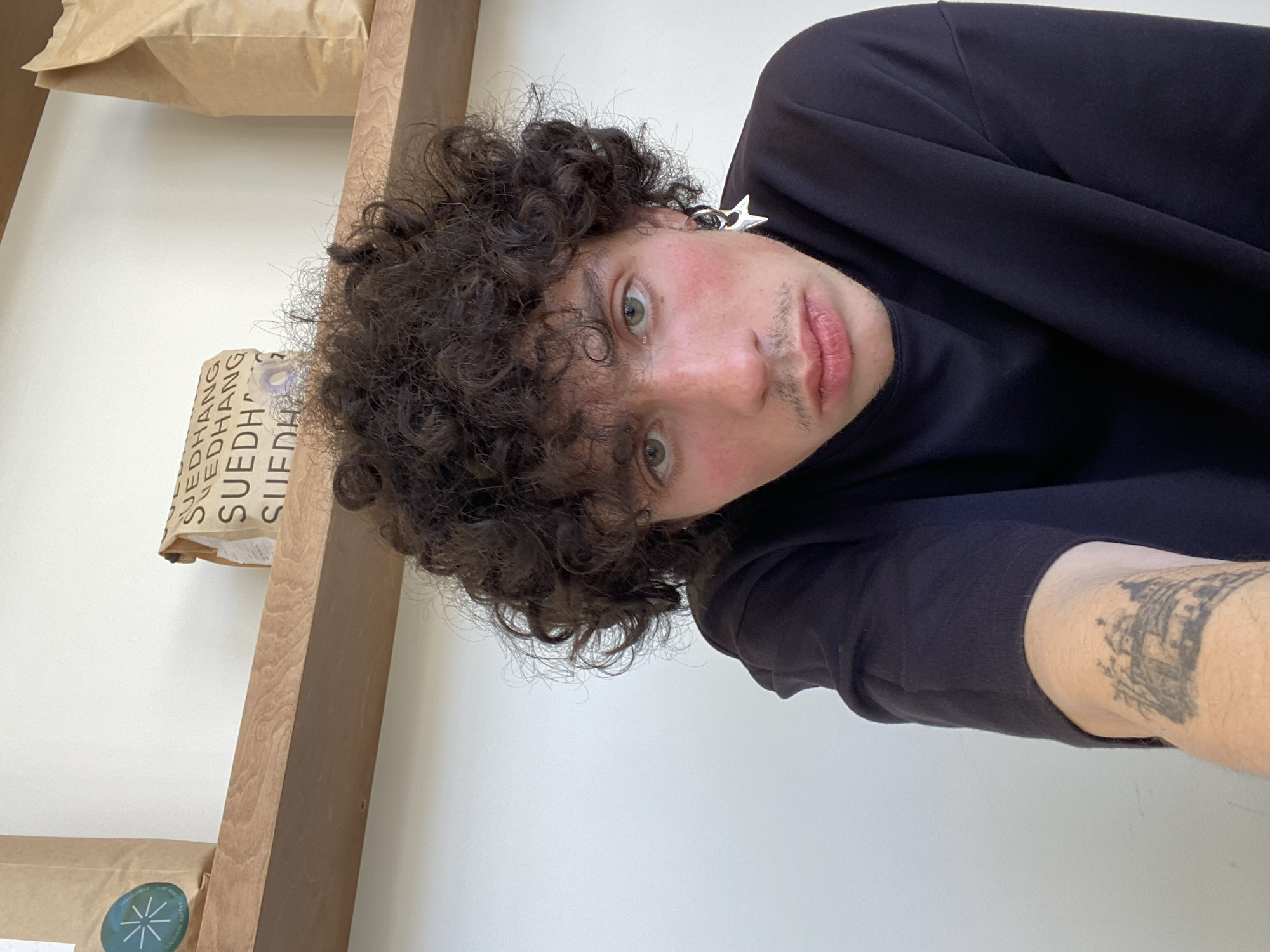 A head-and-shoulders portrait depicts a young individual with dark, curly hair and green eyes, looking directly at the camera. The subject has light stubble on the upper lip and chin, and prominent reddish pigmentation on both cheeks. They are wearing a black long-sleeved top. A silver-toned hoop earring with a star-shaped charm is visible on the subject's left ear, and a dark, illustrative tattoo of a cityscape or building structure is present on the inner bicep of their left arm. The background consists of a plain light-colored wall with a wooden shelf mounted above the subject's head. On the shelf, multiple craft paper bags are displayed. One bag on the left features a blue circular label with a white emblem and partially visible text "SVEDHANG KOFFEE." Another bag, centrally located, is printed with the repeating text "SUEDHANG." A third, plain craft paper bag is visible on the right. This interior setting, specifically identified by the "Suedhang Koffee" branding, places the scene within the Suedhang coffee shop in Tel-Aviv, Israel.