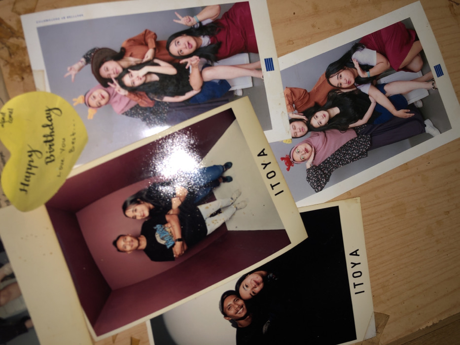 The image displays a flat lay arrangement of five instant photographs and a yellow heart-shaped note on a light brown wooden surface in Tlogo, Indonesia. A yellow heart-shaped sticky note, slightly curled at the edges, is positioned at the top center. It bears handwritten text: "Happy Birthday Love You Best..." with smaller text "alfad amel" above. The photographs include: 1. **Top-left:** Partially visible, out-of-focus portion of an individual. 2. **Mid-left:** A portrait-oriented photo featuring a male and a female, both smiling at the camera, with their heads close together against a dark background. The male wears a dark top; the female wears a dark top. The word "ITOYA" is printed at the bottom of the white border. 3. **Center:** A larger portrait-oriented photo shows a male and female standing inside a small, maroon-walled room with a white floor. The male, on the left, wears a black t-shirt, splatter-painted light pants, and light shoes, with arms crossed and a slight smile. The female, on the right, wears a dark long-sleeved top and blue jeans, with her arm extended towards the male, also smiling. A bright light reflection obscures the lower right portion of the photo. The word "ITOYA" is printed at the bottom of the white border. 4. **Top-right:** A portrait-oriented photo of five young women posing against a light gray background. One woman wears a pink hijab with orange bunny ears and makes a peace sign. Another wears a brown hat and a brown shirt, also making a peace sign. A third woman sits, wearing a dark top and blue skirt, with one hand near her face. A fourth woman in a dark red dress makes a peace sign with her tongue slightly out. A fifth woman's face is partially visible in the background. 5. **Bottom-right:** A portrait-oriented photo of five young women posing against a light gray background. One woman, wearing a pink hijab with red crab-claw headwear and a patterned dress, leans her head against her hand with a fish-face expression. Another woman in a brown shirt is partially visible. A third woman, with long dark hair, wears a dark top and blue skirt, sitting. A fourth woman in a dark red dress with a white collar makes a pouty face. A fifth woman's face is partially visible. Blue horizontal stripes are printed at the bottom of the white border.