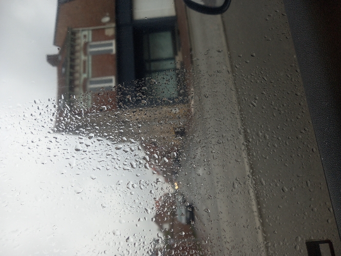 The image depicts an exterior street scene in Sallaumines, France, viewed through a rain-covered window, likely from inside a vehicle