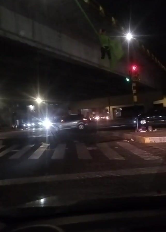 person hanging from a bridge at night. The person appears to be wearing a green shirt and shorts, and is holding a large green cloth. The person swings slightly on what appears to be a rope or cable. Traffic lights are visible with one lit red. Cars are driving on the road below. Street lights illuminate the scene. The video is taken from inside a car. The windshield and dashboard are visible.