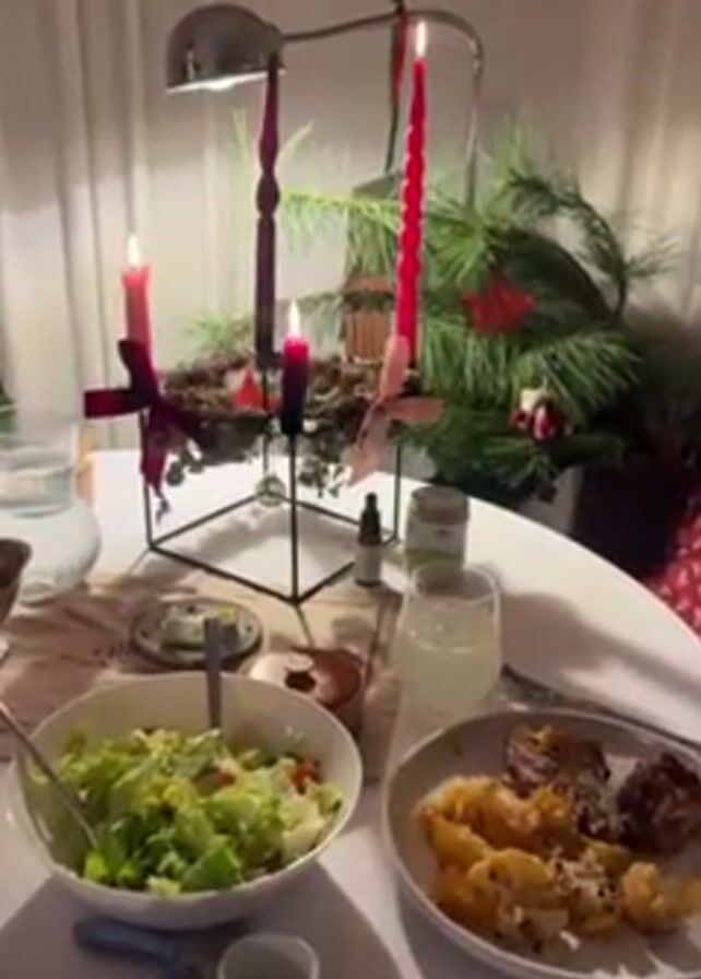 holiday dinner table with a modern Advent wreath at the center. Three tall, colorful candles are lit, adorned with ribbons. A silver lamp shines on the wreath. A plate of salad, another of what appears to be fried potatoes and meat, and a clear drink are visible on the white table. Various small containers and utensils are scattered around. In the background, a decorated evergreen branch leans against the wall. The camera slowly zooms in toward the wreath.