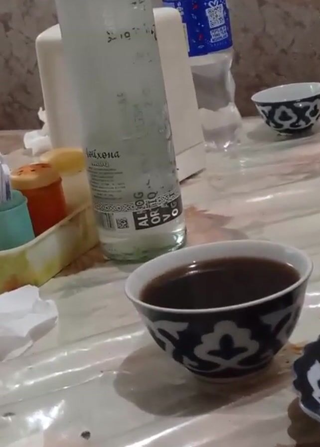 table set with food and drinks. The table is covered with a clear plastic tablecloth with a marble-like pattern. There are several plates with food, including what appears to be fried food and salads. There are also small bowls with a traditional blue and white pattern, some containing a dark liquid, possibly tea. A tall glass bottle of water and a smaller plastic bottle are visible. A green plastic basket containing bread is also on the table, along with a cell phone. The background appears to be a simple wall. The video is shaky, indicating it was likely taken by hand. There are no people clearly visible in the frame.