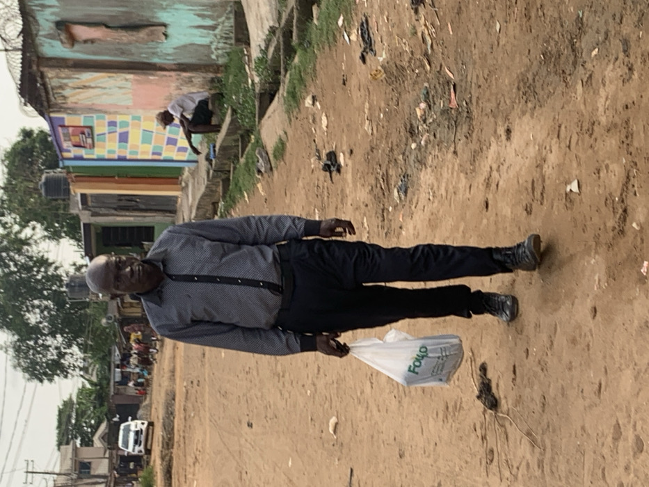 An elderly man in a button-down shirt and dark pants walks on a dirt road, carrying a white plastic bag
