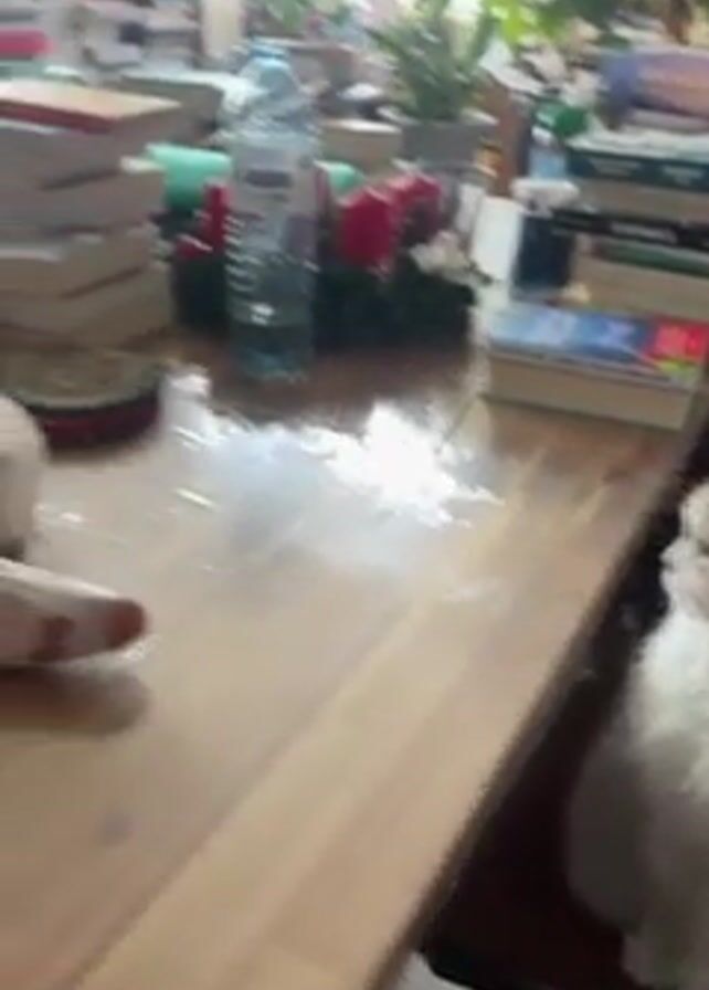 cluttered room with a long wooden table as the central focus. On the table are various items, including a plastic bag filled with bread, a water bottle, an advent wreath, and what appears to be a clear plastic tablecloth covering the surface. A large, fluffy white cat sits on a wooden chair beside the table, facing away from the camera initially but then turning its head. The room is noticeably messy, with stacks of books piled high on surfaces throughout the room and near the windows. In the background, there's another chair with a red garment draped over it. A person holding a piece of bread enters the frame briefly, and a dog is visible behind them. The overall setting gives the impression of a lived-in space with a focus on reading and collecting books.