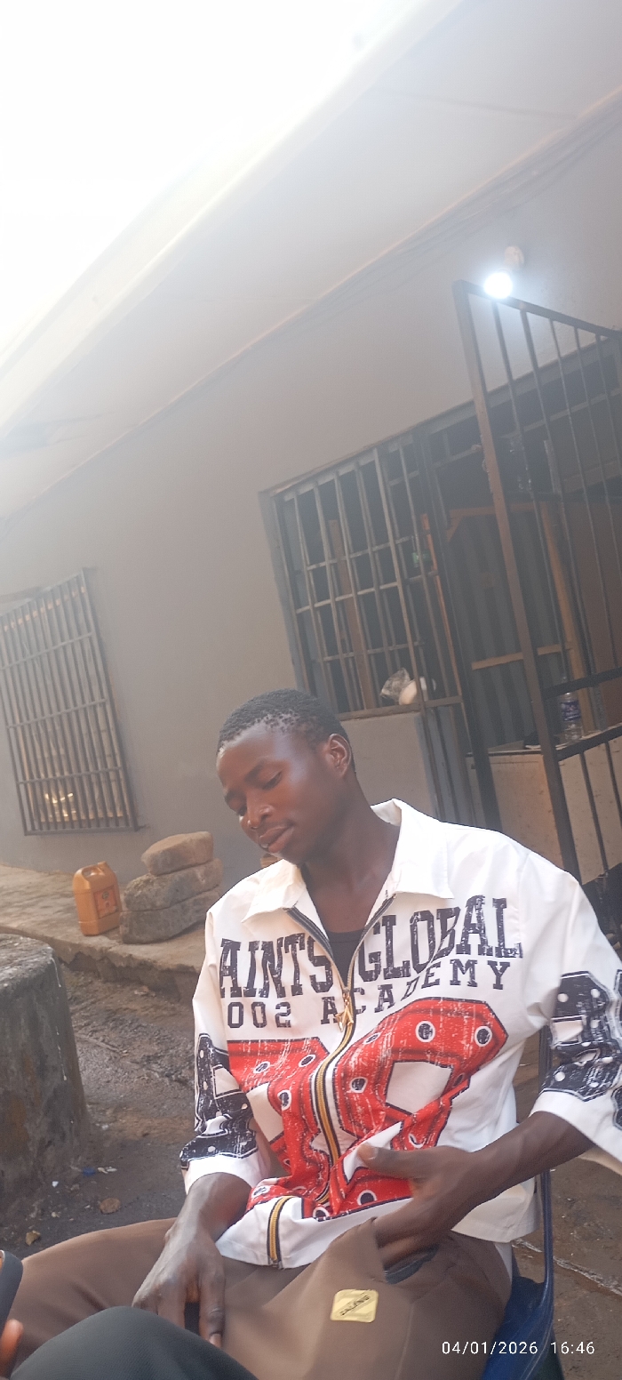 A young adult male, dark-skinned with short dark hair, is depicted seated outdoors, leaning forward with his head slightly bowed. He is wearing a white collared shirt with red and black graphics, including text that reads "SAINTS GLOBAL 002 ACADEMY," over a black undershirt. A gold-colored zipper pull is visible at the shirt's collar, and a gold-colored chain or pendant hangs around his neck. He is dressed in brown trousers, and his hands are resting on his lap or upper thighs. A blue plastic chair is partially visible beneath him. The background consists of a light-colored building wall, possibly gray or beige. Two windows, each fitted with multiple horizontal and vertical metal security bars, are visible in the wall. To the right, an entrance or doorway is also secured with metal bars. A bright, circular white light fixture is mounted high on the wall to the upper right, actively illuminating the area. On the ground to the left of the seated individual, an orange plastic jerrycan and three stacked, roughly circular grey stones or concrete blocks are present. Near the metal-barred entrance on the right, a clear plastic water bottle and some white debris are visible on the unpaved ground. The ground surface appears to be dirt or uneven concrete. The timestamp "04/01/2026 16:46" is present in the lower right corner of the image. The location is an outdoor area of a building in Unknown, Unknown.