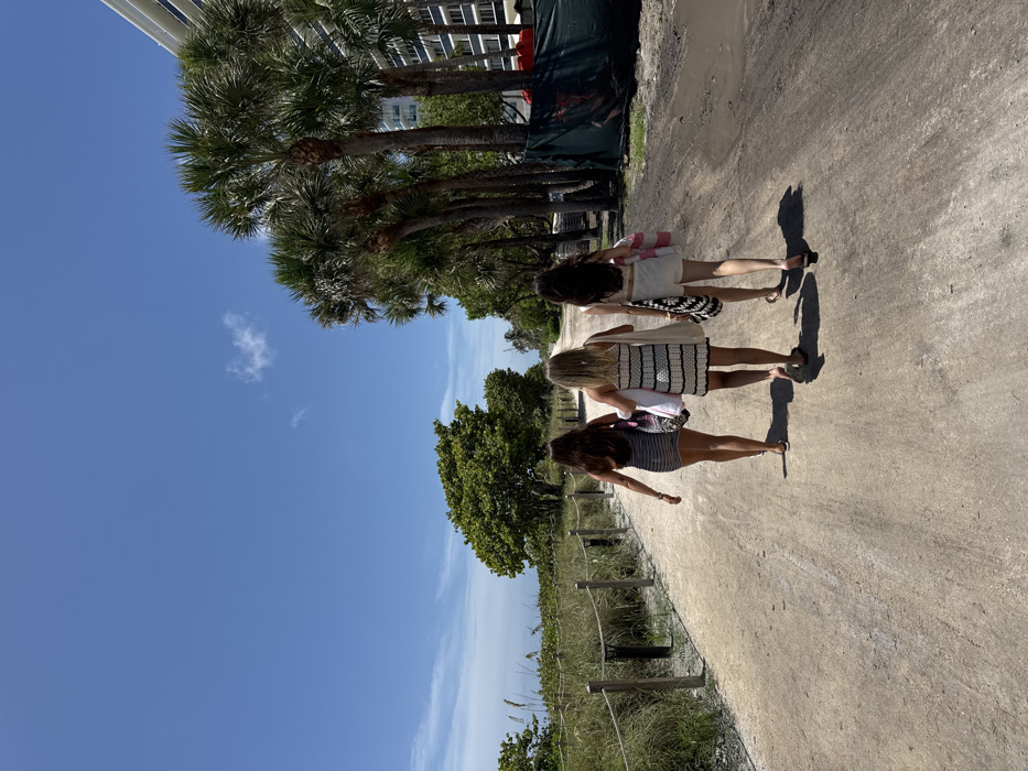 A forensic examination of the image reveals three adult females walking away from the camera, side-by-side, on an unpaved, light-colored sandy-dirt path under a clear blue sky in Surfside, Florida, United States