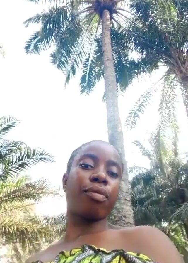 A person is standing outdoors, looking at the camera. The person is dark-skinned, and wearing a colorful, patterned strapless top. Behind the person are several tall palm trees. The sky is visible between the palm fronds. The lighting is bright. The person smiles.