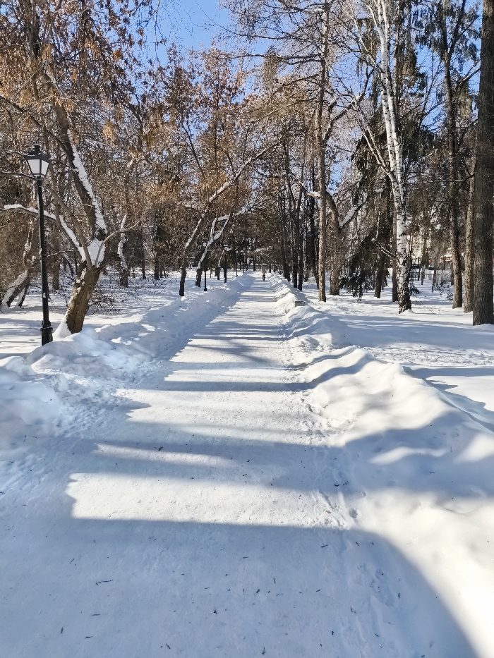 A snow-covered path stretches through a park in winter, bordered by bare trees. A lamppost stands to the left. Snowbanks line the path's edges, and shadows from the trees create a stark contrast on the bright white surface. The sky is a clear blue, visible through the tree branches. In the distance, a small figure walks along the path.