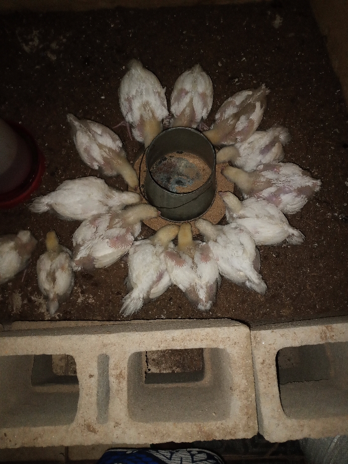 This image, captured in Sabon Tasha, Nigeria, displays an indoor poultry enclosure containing approximately 17 young broiler chickens