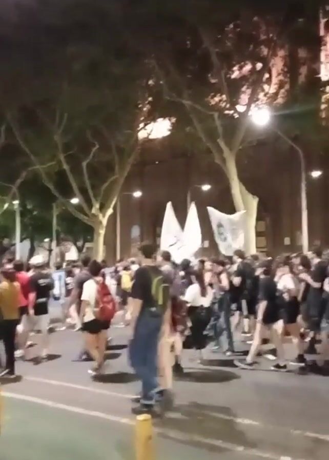 At night, a large group of people walks along a paved street toward a tall, ornate building. The people are diverse in appearance and attire, some carrying flags or signs. The street is lit by streetlights and lined with trees. There are short, yellow bollards lining the edge of the pavement. The building is visible in the distance, illuminated against the night sky. The overall atmosphere suggests a demonstration or public gathering.