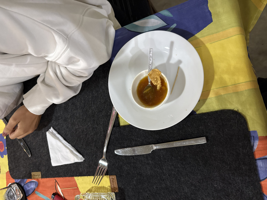 The image captures an overhead view of a dining table setting in Bentota, Sri Lanka. A person in a white long-sleeved sweatshirt is partially visible, with their forearms resting on the table. Their right hand, featuring painted fingernails, is positioned on a dark grey felt placemat near a silver knife. A folded white paper napkin rests centrally on the placemat. A silver fork is positioned above a second silver knife on the placemat. In the upper left, a clear, patterned glass and a red cigarette lighter are visible on the colorful tablecloth. A small white bowl, containing a brown, chunky sauce or dip, is centered on a larger white plate in the lower right quadrant. A small, decorative spoon is partially submerged in the sauce, with a light brown, crisp food item resting on its edge. A wooden toothpick lies on the large white plate. The table is covered by a vibrant tablecloth displaying yellow, orange, blue, and black patterns.