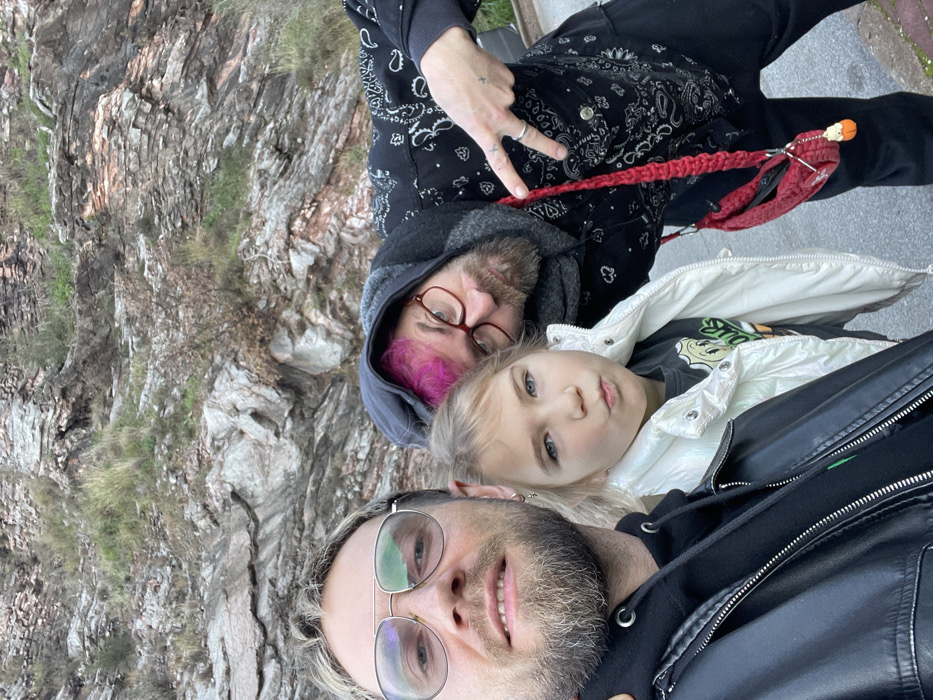 A selfie captures three people against a backdrop of a rocky cliff. The person in the foreground wears glasses and a black jacket, smiling into the camera. Above them is a young child in a white jacket and a man with pink hair wearing glasses, a gray hoodie, and a black bandana-patterned shirt. The man is making a peace sign. A red leash-like object is draped across the man's chest, appearing to be attached to a small orange and white object.