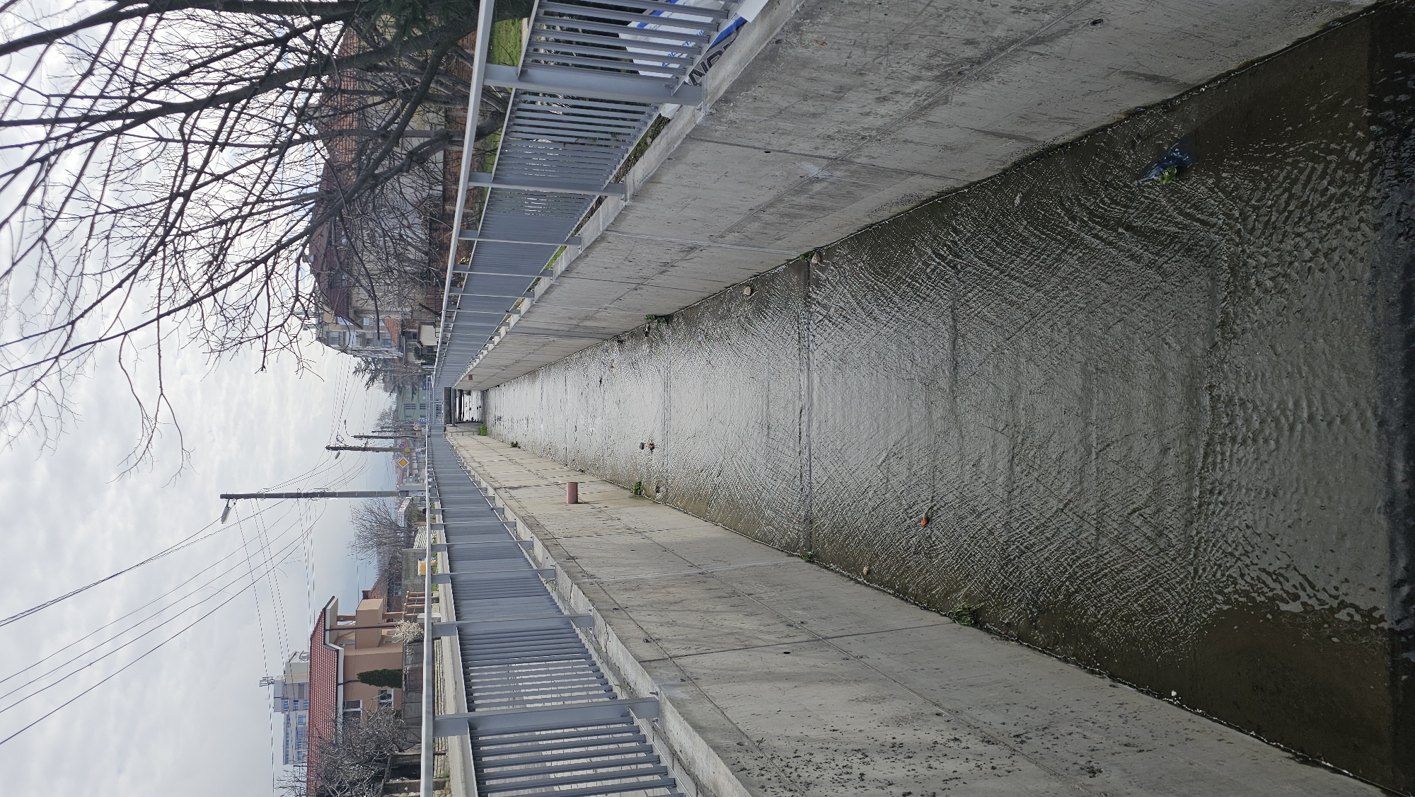 The image depicts a concrete channel with water flowing through it. The channel is bordered by concrete walls and metal railings on either side. In the distance, buildings and utility poles can be seen, suggesting an urban setting. The sky is overcast. A cylindrical object lies on the concrete walkway beside the channel. The water has a rippled surface. Some debris or trash is visible floating in the water. The tree branches with no leaves at the top left suggest it is either winter or early spring.
