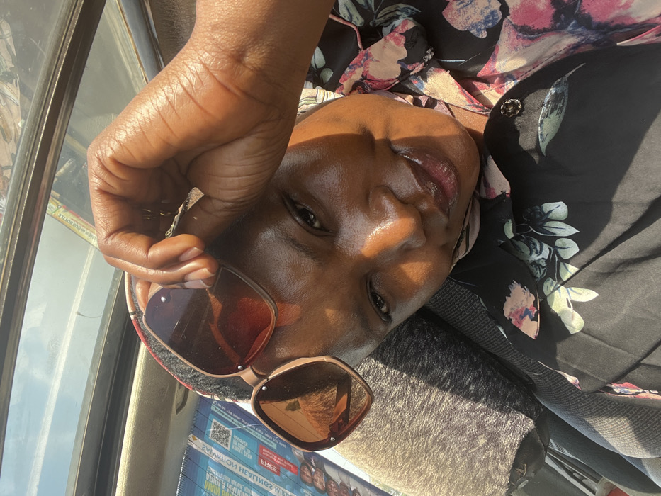 An individual with a dark skin tone is seated in the interior of a vehicle in Kugbo, Nigeria