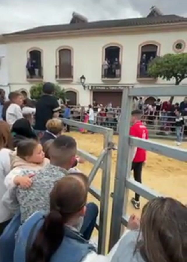 crowd watching a bullfight in a sandy ring. The camera focuses on a group of spectators standing behind a metal fence that encircles the ring. Several people are visible in the crowd, including children, adults, and teenagers. In the center of the ring, there are people and movement. There is a white building across the ring with people watching from balconies. The sky is overcast.