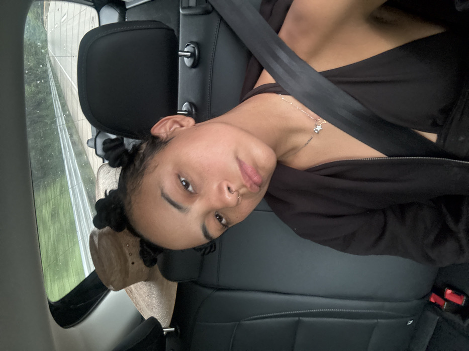 A female individual with medium skin tone and dark hair styled in two buns is depicted seated in the rear passenger compartment of a vehicle