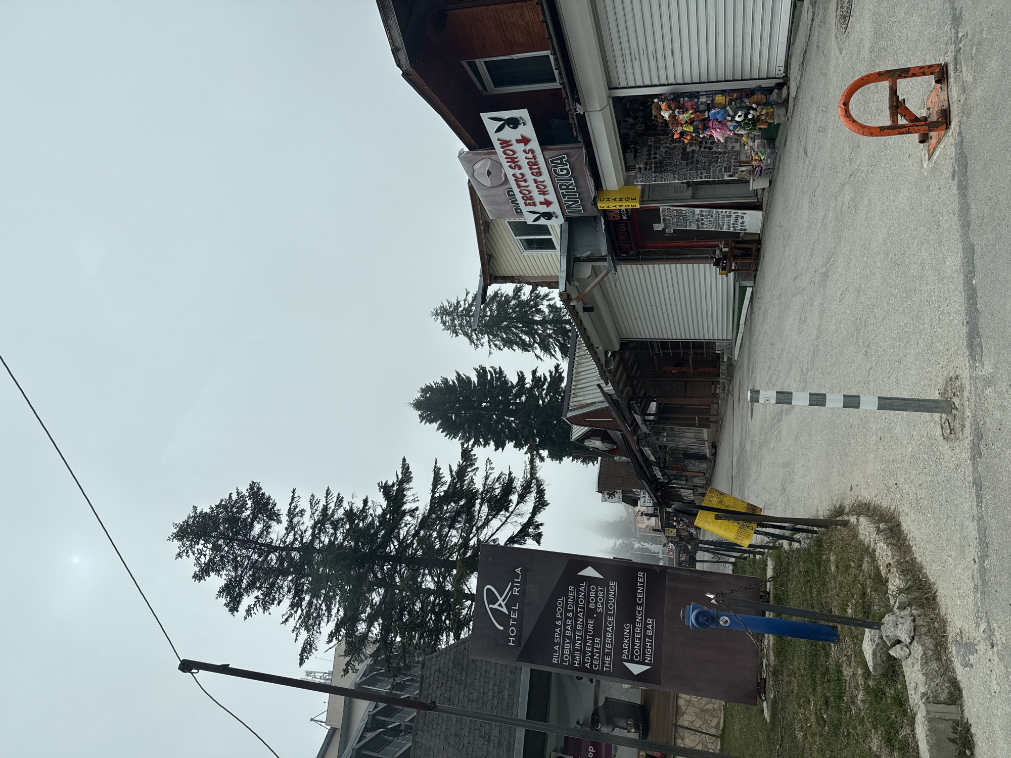street scene in Samokov, Bulgaria. In the foreground is a sign for "Hotel Rila" listing amenities like a spa, lobby bar, international center, and conference center. Adjacent to the hotel sign is a blue fire hydrant. Behind the sign are pine trees and other buildings partially obscured by fog. Further down the street is a building with closed roll-up doors. Above the doors is a sign advertising an "Erotic Show" with "Hot Girls" and the name "Intriga." A merchandise stand displaying various toys and souvenirs can be seen in front of the building. An orange, metal parking barrier is on the edge of the street. The sky is overcast and gray. The street itself is paved.
