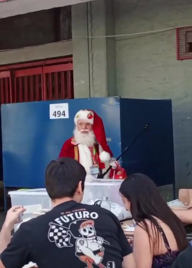 - "man dressed as Santa Claus sitting at a table marked "Mesa 494" (Table 494)" by FM-Luk4a2, licensed under CC BY 4.0