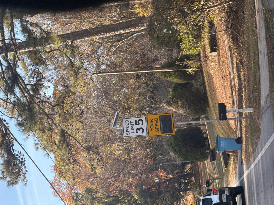 A roadside view features a "Speed Limit 35" sign alongside a digital display showing "Your Speed." A mailbox with the number 1390 is visible. A blue trash bin sits on the shoulder of the road, near the edge of a brown grassy area. A white SUV is parked on the road. Overhanging trees with autumn-colored leaves frame the scene under a blue sky.