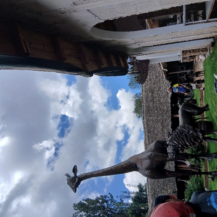 The image depicts an outdoor environment in Mweka, Tanzania, under a sky with scattered white clouds. A large, dark-toned giraffe statue stands prominently on a patch of green grass in the left-center, with a dark-toned lion statue positioned beneath it. To the right of the lion, a male individual wearing a blue and yellow shirt, white shorts, and a red cap is visible, holding a leash attached to one of several smaller animal statues. In the far left foreground, the back of a person's head, wearing a red cap, is present. Architectural features include a building with a substantial thatched roof in the mid-background and a light-colored building with an arched opening and exposed wooden eaves on the right side of the frame. Trees are visible on the left and in the distance.
