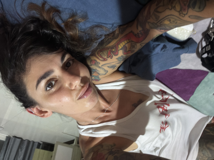 The image captures a female individual lying in an indoor setting within Nusa Dua, Indonesia, likely a private room or accommodation. The subject has dark hair and dark eyes, looking directly towards the camera with her head resting on a blue fabric or pillow. Her torso is supported by a multicolored fabric. She wears a white ribbed tank top with red vertical characters, resembling Asian script, centered on the chest. A thin silver chain necklace is visible. Both arms display extensive tattoos, including a red dragon-like motif on her right arm and cartoon-style figures on her left arm. To the left of her body, a black object with white lettering and a small white, possibly plastic, container are partially visible. The background consists of light-colored walls or furniture and a dark curtain, indicating an interior space with diffused artificial lighting.