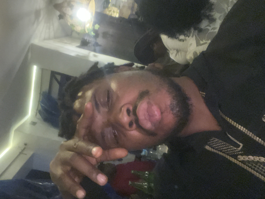 A Black man with dreadlocks is up close in a selfie. He's pouting at the camera, with his hand near his face. He's wearing a black shirt with gold patterns. In the background, there's another person with an afro. The background is somewhat blurry, but there appear to be bottles and other items on a table. The lighting is bright, and the overall image feels casual and candid.