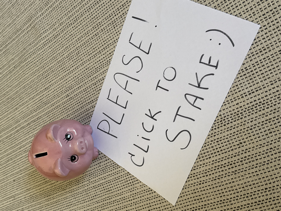 The scene depicts a still life arrangement on a textured, light beige or tan surface, possibly a carpet or fabric. In the upper left quadrant, a small, glossy pink ceramic piggy bank with a coin slot on its back is positioned. The piggy bank features cartoonish black eyes with white highlights and distinct eyelashes, a small snout with two nostrils, and small ears. Directly below and slightly to the right of the piggy bank, a rectangular piece of white paper is placed diagonally. Handwritten in black marker or pen on the paper are the words "PLEASE! click TO STAKE :)" The exclamation mark, letters, and smiley face are all clearly visible. The overall composition suggests an appeal or instruction related to financial participation, possibly in a digital context like cryptocurrency staking. The image itself provides no discernible environmental details or landmarks to confirm a specific location within Hainburg an der Donau, Austria; the setting appears to be an indoor, generic surface. There are no individuals present in the frame, and no active interactions are depicted other than the arrangement of the objects.