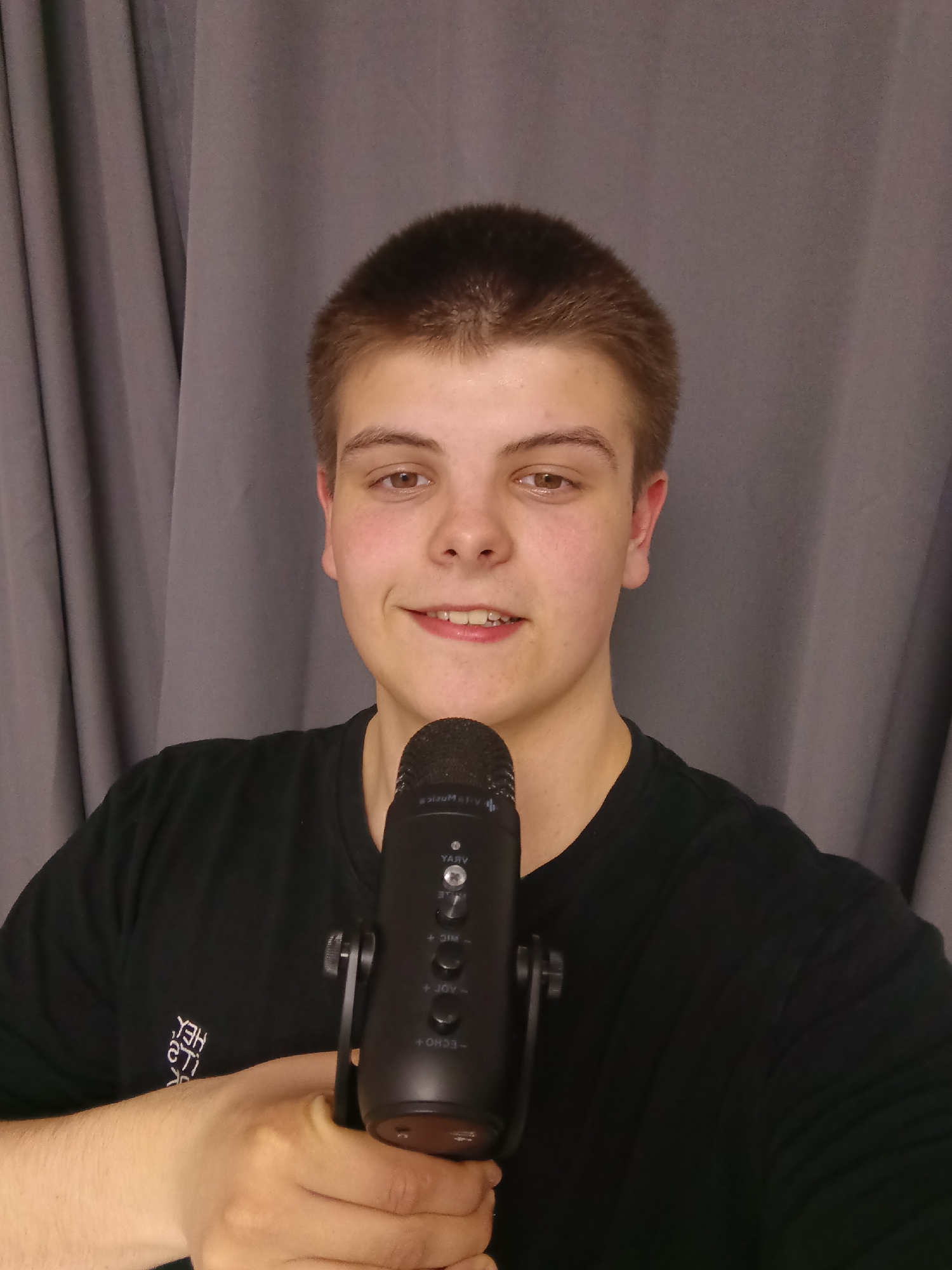 A young man with short brown hair and brown eyes smiles while holding a black microphone