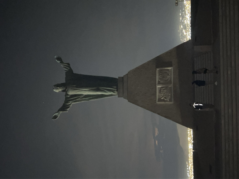The Christ the Redeemer statue stands prominently against a dark sky. Its arms are outstretched, and the city lights glitter in the distance. The statue's base has ornate carvings. Some people are walking on the stairs beside the statue's base. The overall atmosphere is somewhat hazy due to the dim lighting.