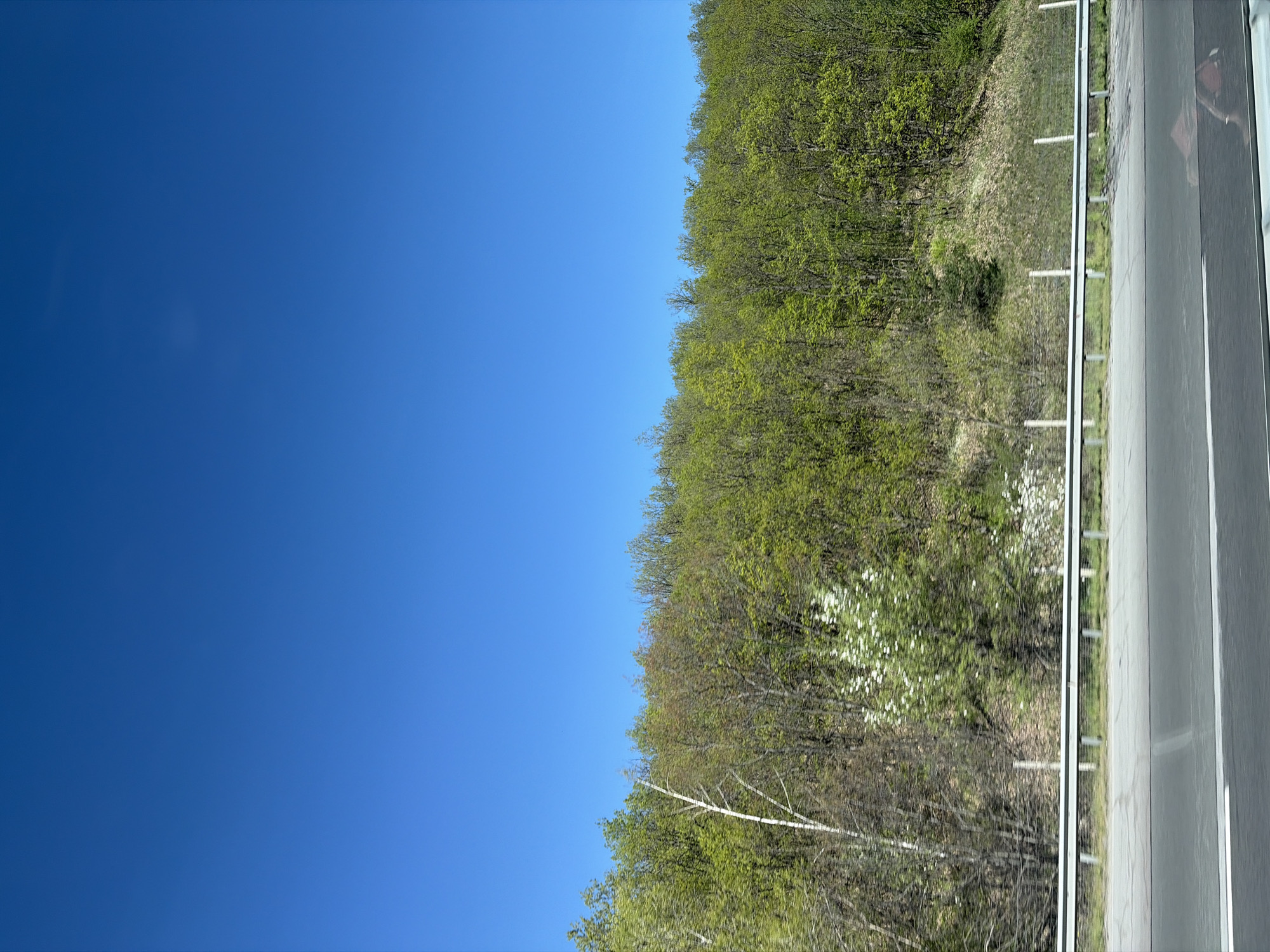The image depicts a view of a bright blue sky above a forest bordering a road in Dolna Vasilitsa, Bulgaria. The forest consists of trees with varying shades of green foliage, along with some white flowering trees. A silver guardrail runs along the edge of the road. A portion of the road and the side of a vehicle, possibly a bus, are visible on the right, with a blurred reflection of a person visible in the window.