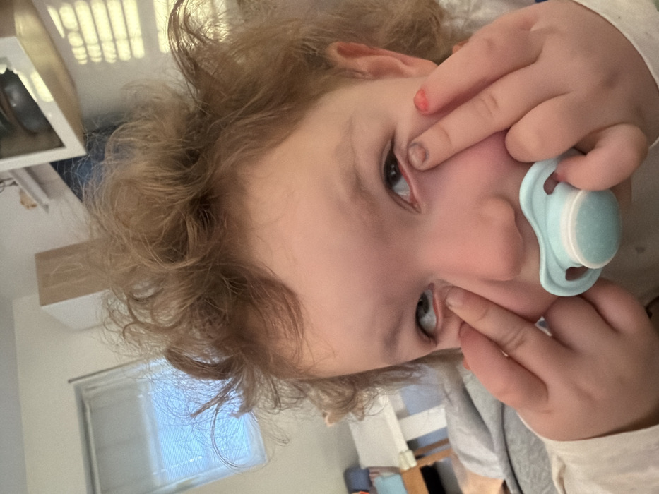 The image depicts an indoor scene located in Trassem, Germany. A young child, appearing to be approximately 1-3 years old, with disheveled light brown or blonde curly hair, is positioned in a close-up, frontal view, occupying most of the frame. The child's lower eyelids are actively pulled down by their index fingers, revealing the red conjunctiva. Their eyes are rolled upwards and slightly to the right. A light blue pacifier with a white center is present in the child's mouth. The child's left index finger (viewer's left) shows a dark smudge under the fingernail. The right index finger (viewer's right) exhibits a reddish stain on the fingertip. The child is wearing a light-colored long-sleeved garment. The background shows an indoor room with light-colored walls. To the upper left, a window with horizontal blinds is visible, admitting light. Below the window, a grey blanket or bedding, possibly on a bed or sofa, and a folded blue and orange blanket are partially visible. In the upper right background, another window with horizontal blinds casts parallel light stripes, and above it, a white shelf or cabinet with a dark object is present. A light brown, rectangular object, possibly a box or furniture, is visible vertically in the upper-center background.