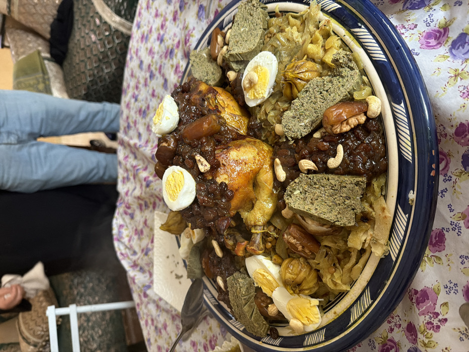A large plate of Moroccan chicken tagine, traditionally served on a large, flat-bottomed dish