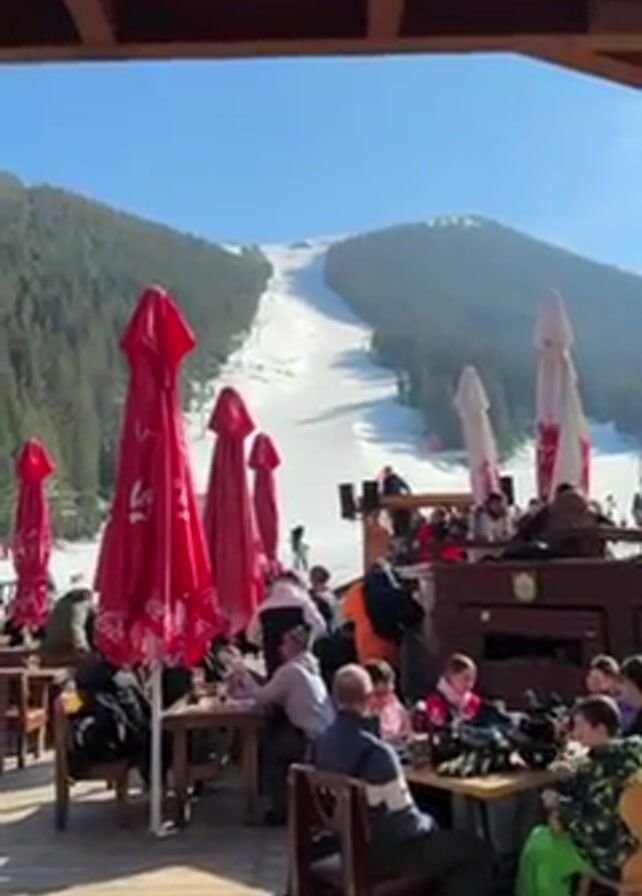 n outdoor seating area on a sunny day at a ski resort. People are sitting at wooden tables, some with red umbrellas. A ski slope covered in snow is visible in the background, framed by a forest-covered mountain. The Bulgarian flag waves in the distance.