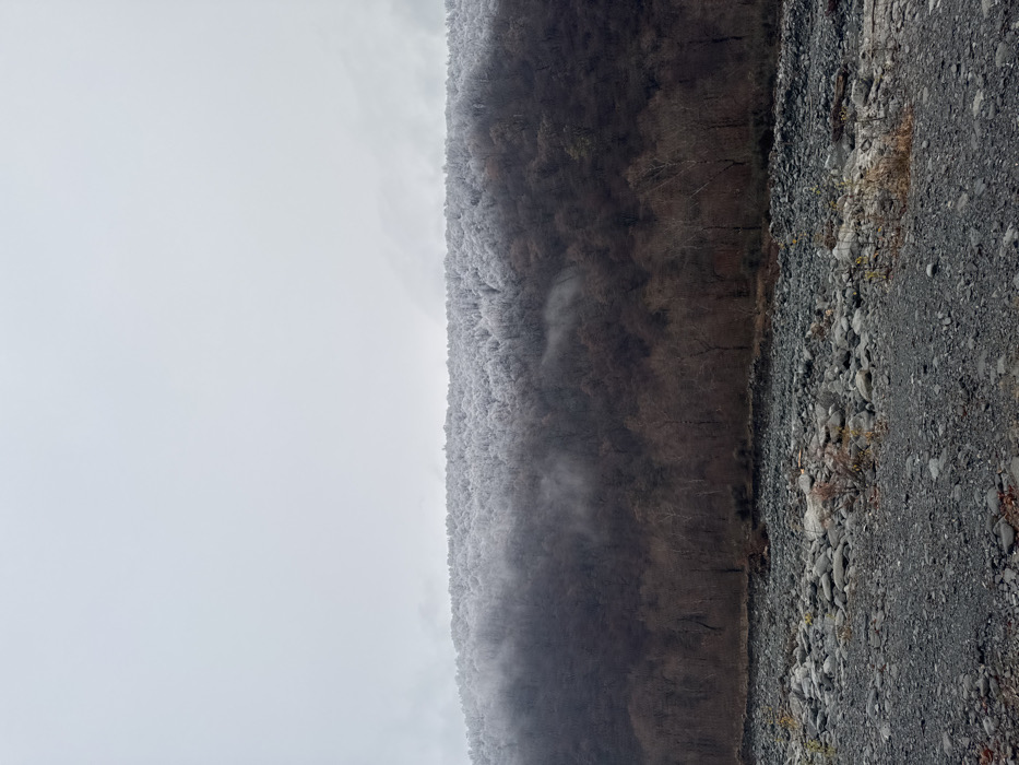 A winter landscape presents a roadside view. Heavily frosted trees line the area adjacent to the rough gravel shoulder. Gray overcast sky consumes the left portion of the image. The trees are dense with little foliage visible, suggesting winter or early spring.