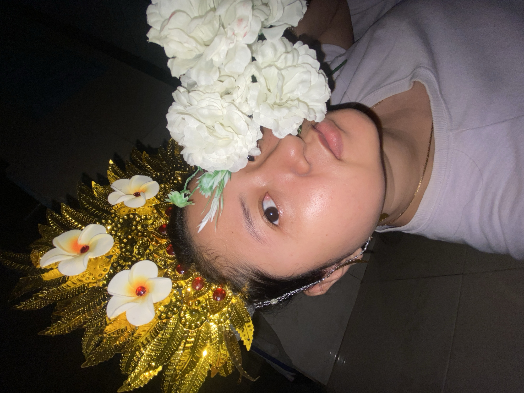 A person is pictured from a close, high-angle perspective. The person's face is positioned centrally in the frame, with a slight tilt. They are wearing a decorative headdress made of gold-colored metal, adorned with white flowers and red jewels. A cluster of white flowers is positioned near the person's nose. The person is wearing a white shirt and a thin gold necklace. The background is dark and partially obscured, revealing a tiled surface. There is no evidence to confirm the location in the city of Gelam, Indonesia.