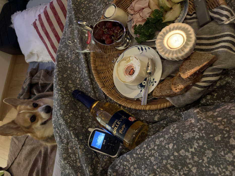 A wicker tray rests on a gray floral-patterned surface, holding a feast: grapes, cold cuts, cheese, bread, and a lit candle. A wine glass and a bottle of "Royal Guillevic Prestige" cider are nearby. A baby monitor is positioned next to the cider. A tan and white corgi peers into the scene from the lower left corner. Pillows with red and white stripes are visible in the background, suggesting a bed setting.